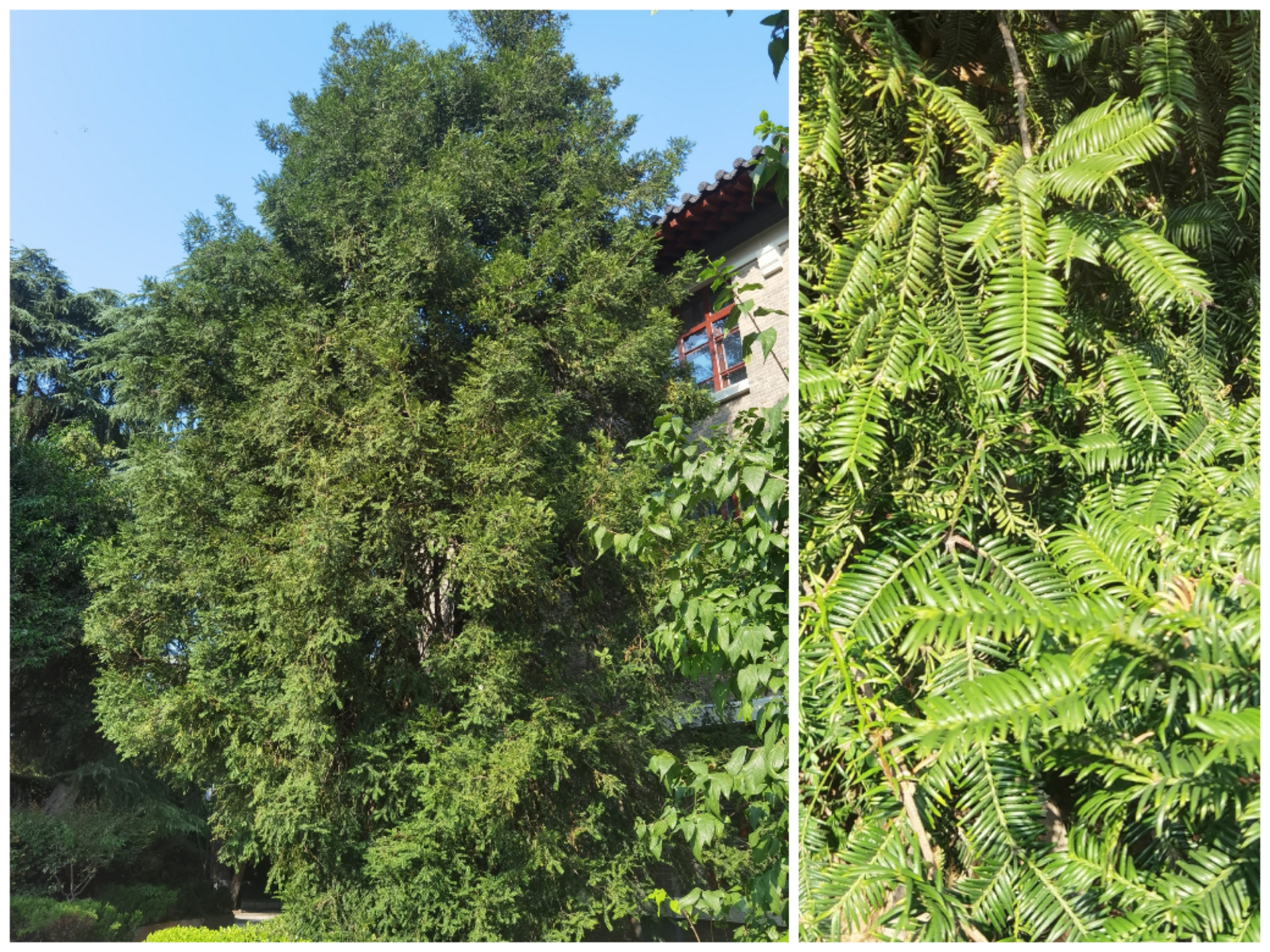乔木,在原产地高达 25 米,胸径 90 厘米;树皮灰褐色或淡褐红色,幼时平滑,老时裂成薄鳞片状脱落;一年生枝绿色,无毛,二年生枝绿色或淡红褐色,三、四年生枝呈红褐色或微带紫色,有光泽。叶条形, 列成两列,直或微弯,长 1.4-3.3 厘米,宽 2.5-3 毫米,基部骤缩成短柄,中上部渐窄,先端有凸起的刺状长尖头,上面微拱凸,深绿色,有光泽,下面淡绿色,中脉平或微隆起,气孔带黄白色或淡褐黄色,较绿色中脉带稍窄或等宽。种子椭圆状倒卵圆形或倒卵圆形,成熟前假种皮暗绿色,熟时紫褐色,长 2.5-3.2 厘米,径 1.3-1.7 厘米,种皮骨质,两端尖,表面有不规则的浅槽,胚乳微内皱。花期 4-5 月,种子翌年 10 月成熟。
