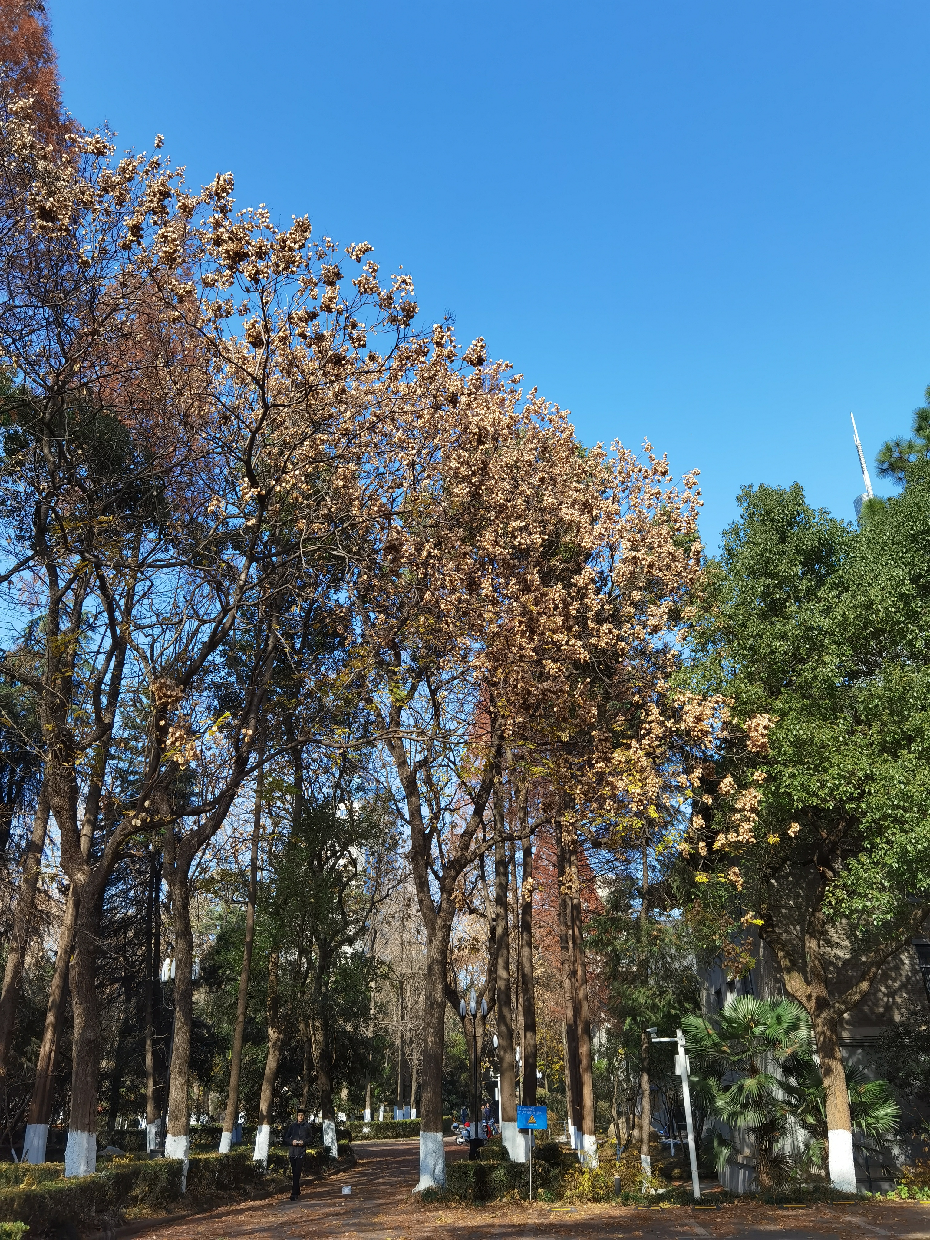 上图为 2021/12/17 拍摄,只有零星叶片,而果实还挂在树梢。