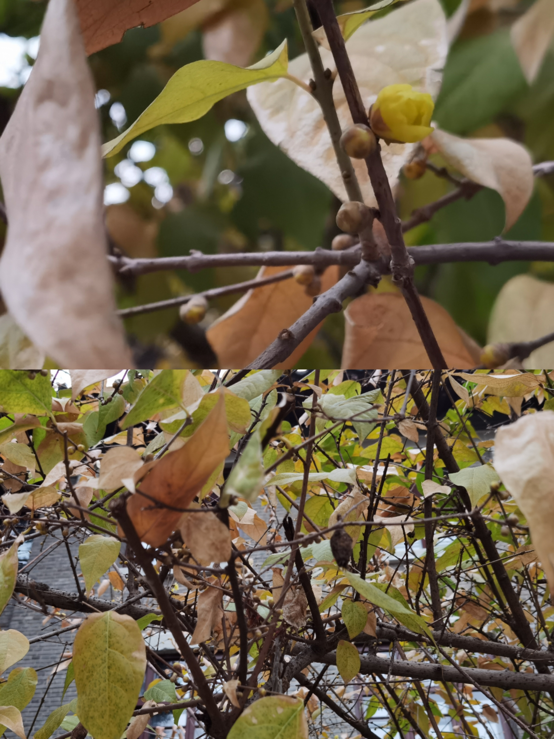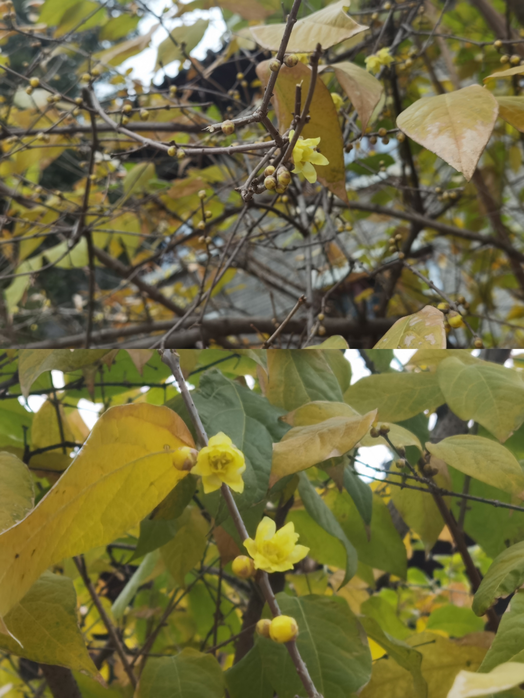 上图摄于 2022/02/16。寒假结束回到学校,蜡梅叶子落光,花期还没有结束。
