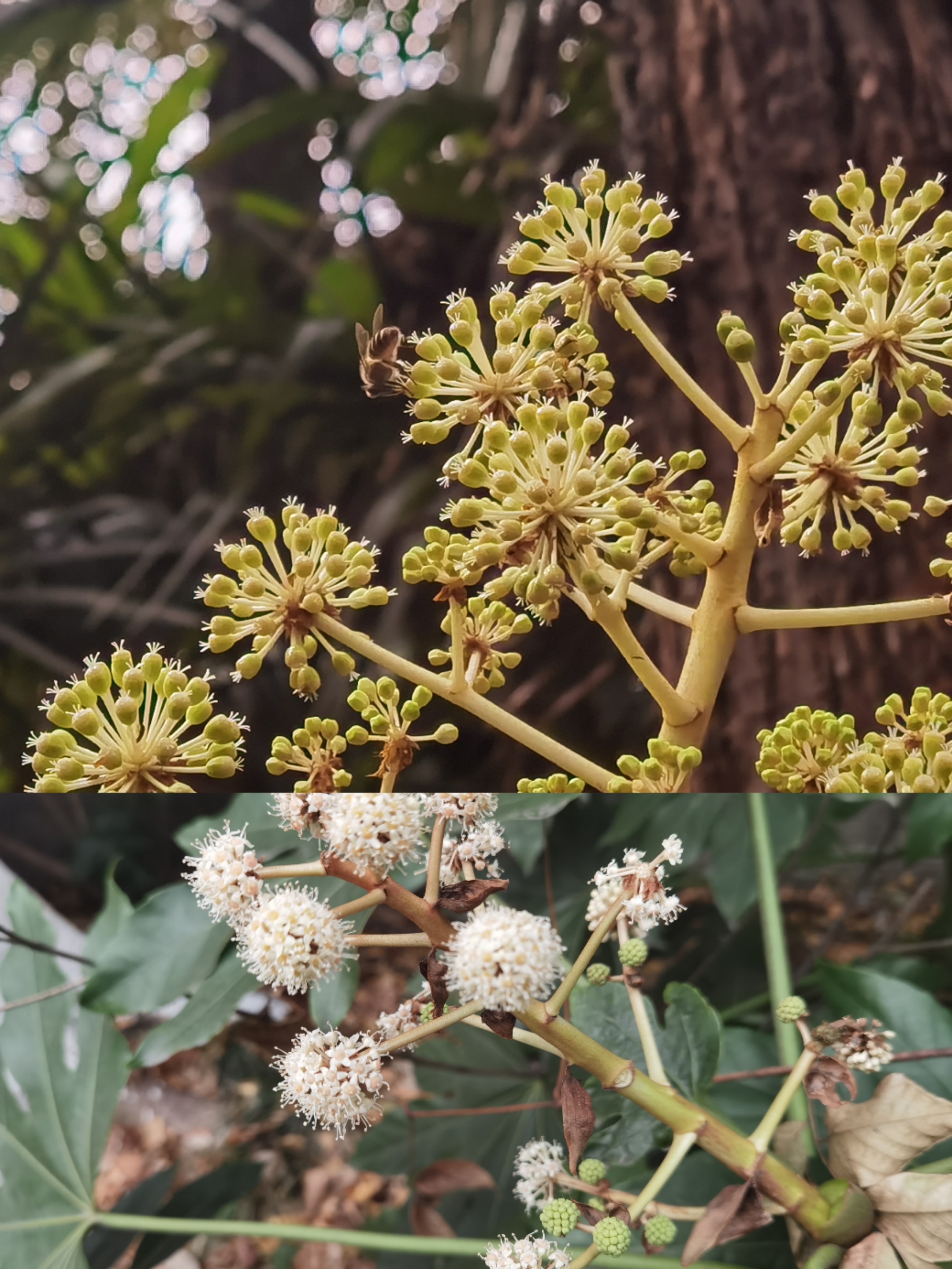 上图摄于 2022/04/01。果皮由绿色变为紫色。八角金盘的花期很长,而且总是能吸引很多可爱的小虫子。记录到此结束,祝八角金盘健康!